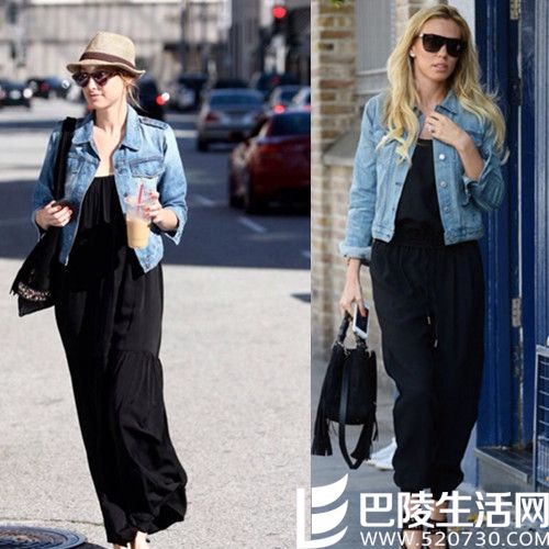 最优雅的搭配方法是牛仔外套配长裙或者连体长裤。长裙和长裤本身就是非常优雅知性的,配上一件简单的牛仔外套,既可以御寒,又可以将自己的长裙和长裤搭出一种截然不同的韵味。如上图中的搭配方式,纯黑色的连体裙,配上牛仔外套毫无违和感。也可以将这种纯色长裙换成民族风的长裙,随风飘逸的长裙和牛仔外套,会更加的有韵味。