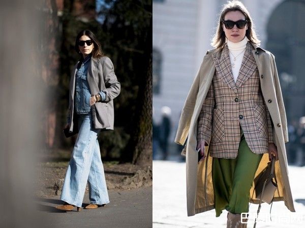 有别于规规矩矩的穿搭,像是成套牛仔装束搭配上西装外装,同样吸睛度十度。还有多层次的穿搭,白色高领毛衣、缎面半裙加上格纹西装外套最后再披上风衣大衣,这款细格纹的西装外套变成穿搭的重心。