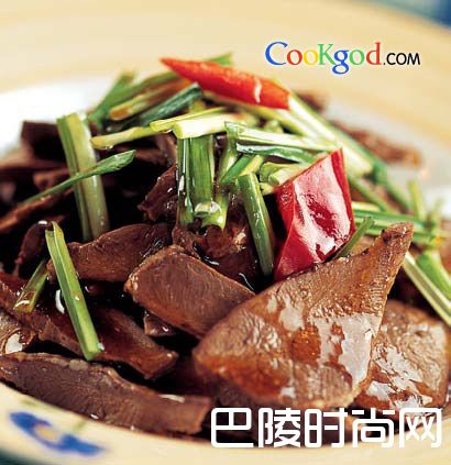 4.锅内放油,烧热,放入辣椒和剩余的葱、姜、蒜煸香,放入猪心片煸炒后起锅盛盘;