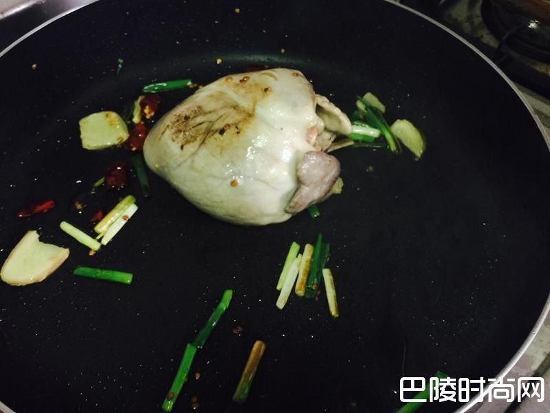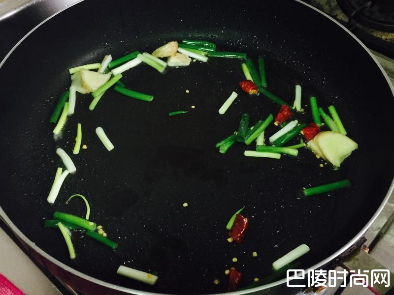 3起一油锅,下葱段、姜片、辣椒下去爆香(小心鼻子别被辣椒呛到)