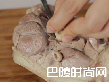 4取出猪肘子,剃去骨棒,将骨棒留在锅中。