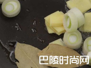 8热油锅,爆香大葱、姜、八角、桂皮、香叶。