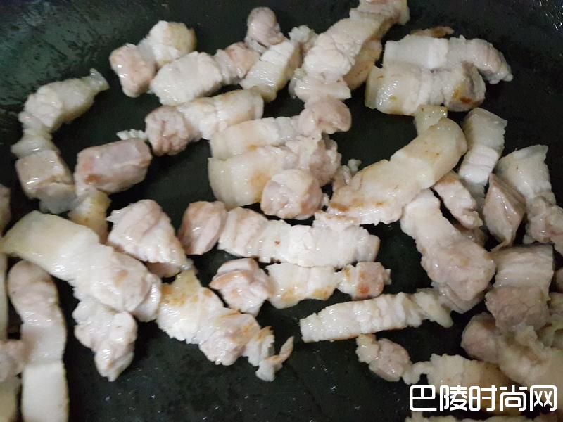 2起锅将五花肉入锅炒香~肉质翻白加入酱油呛锅起锅备用