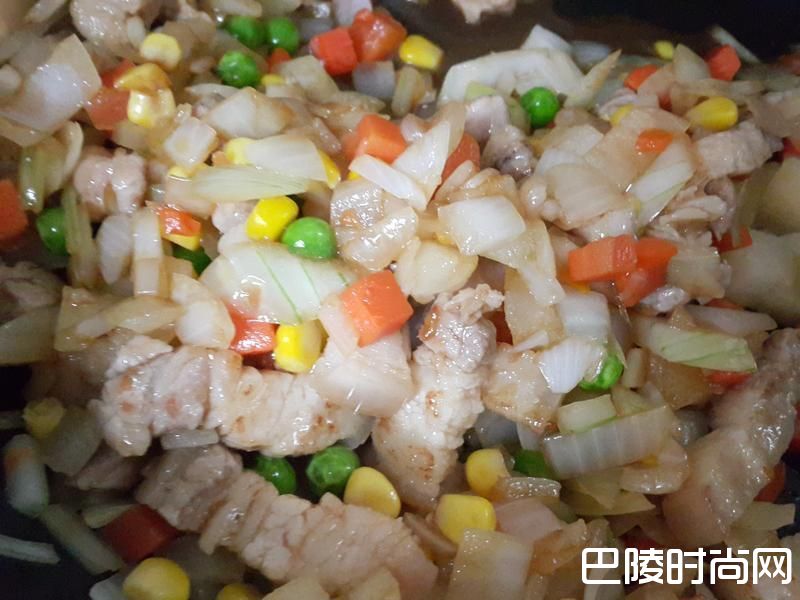 3利用刚材炒肉的油脂炒香洋葱丁变软后倒入四色蔬菜一起拌炒一下再将步骤2倒入一起翻炒