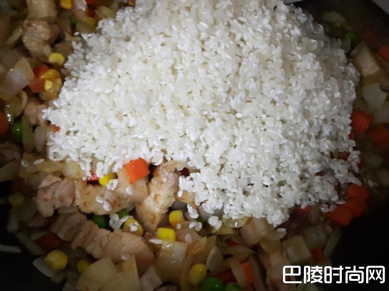 4最后倒入洗净的白米加入适量酱油及调味料一起拌炒均匀