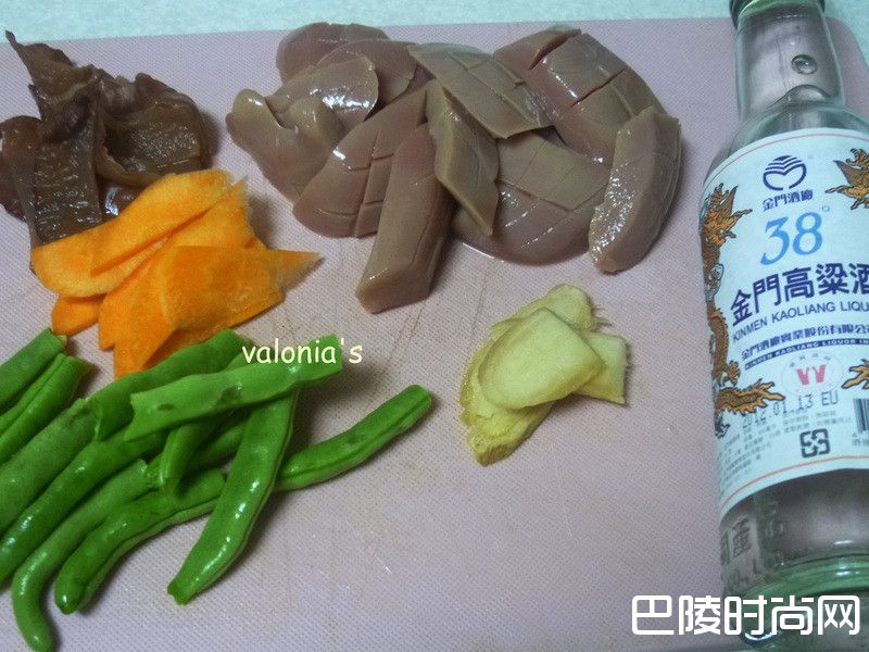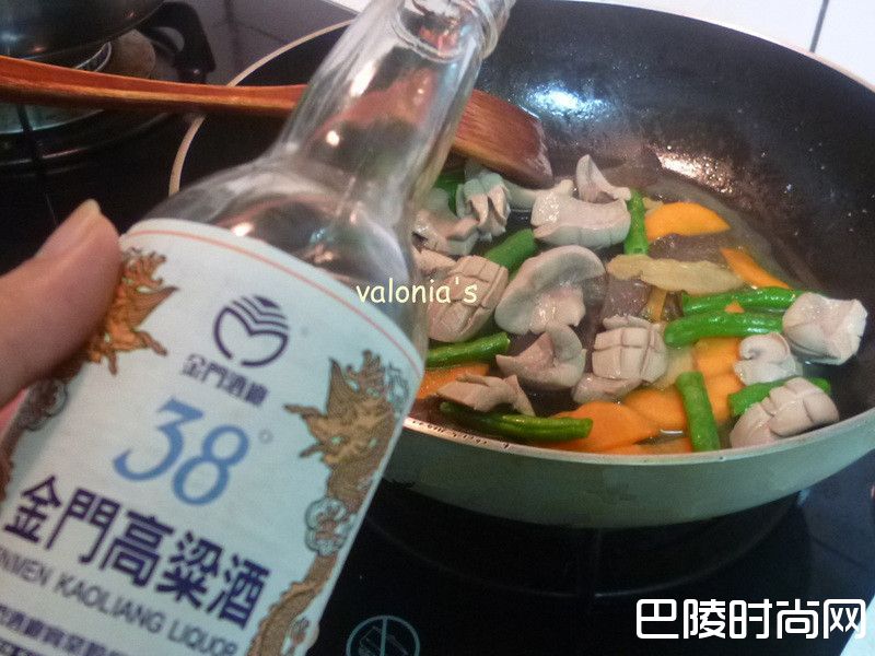 2备一锅滚水,加2大匙金门高粱酒,放入猪腰,大火汆烫30秒,捞起。金门高粱酒一甲子以来,以清澈透明、质地纯净、芳香甘醇,独获行家的青睐,一路走来独领风骚,在『中国白酒』中,一支独秀、闻名于世。