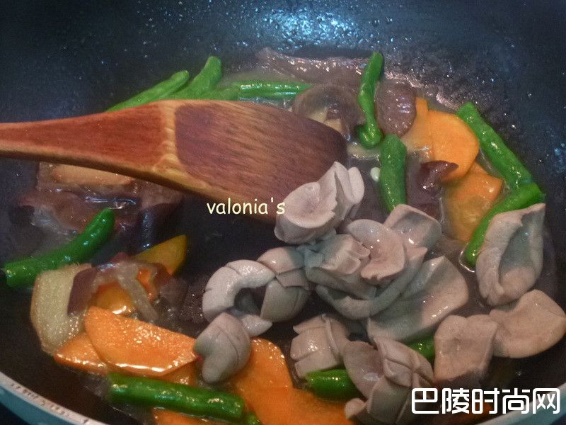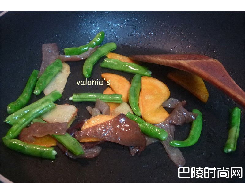 3热油锅,爆香姜片后,将长豆、红萝卜、黑木耳放进,翻炒一下。