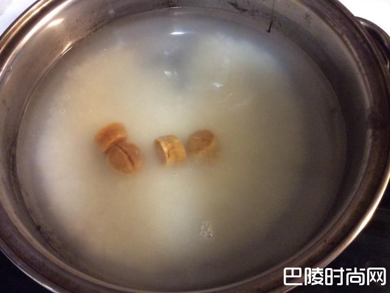 2热锅煲水,放入珍珠米、清鸡汤及瑶柱煮熟。