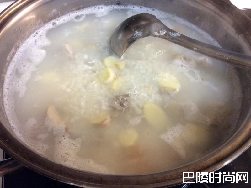 3煮至杰身后,再放入猪骨及姜片多煮一会至入味,如粥黏底可多放些熟水拌匀。