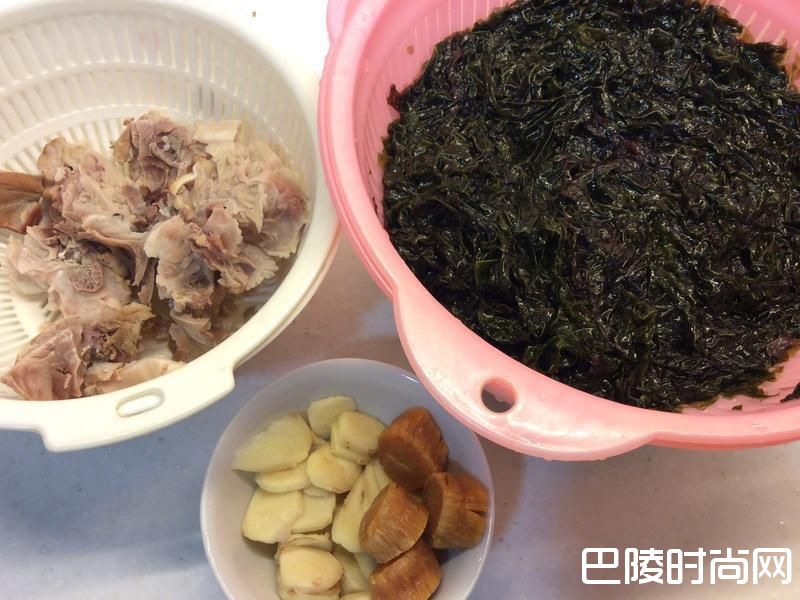 : 乳猪头及紫菜洗净❣猪头去皮去脂氽水、紫菜氽水切碎备用❣姜去皮切片。