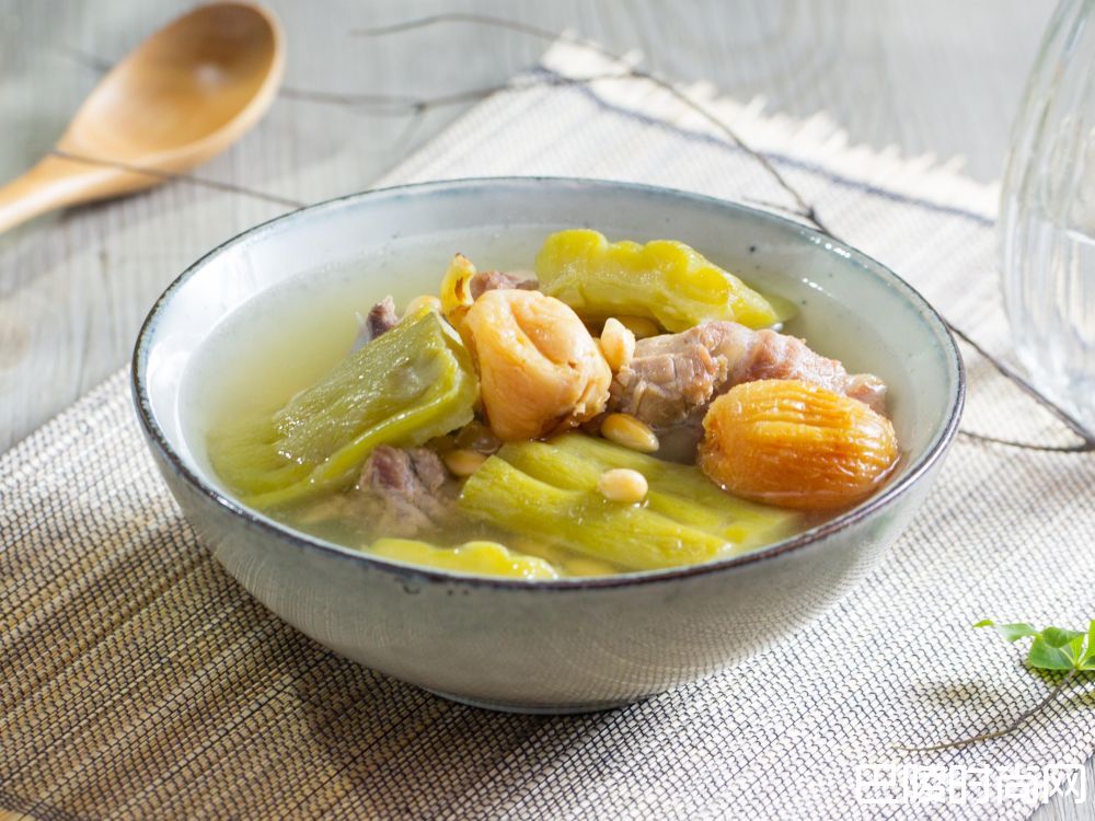 带苦味的蔬菜有清热袪火的作用,最适合夏天食用,这款汤品配搭苦瓜常见的拍档黄豆,再加入无花果乾,令汤更清甜可口。 材料
