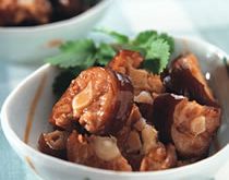 2.另一个锅点上火,放油把超过水的鸡肉放进去,煸超然后放酱油和糖 继续煸超,直到鸡肉挂上颜色。