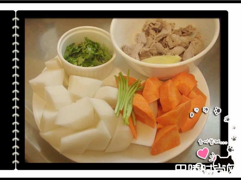 11:牛杂肉先川烫好备用ˊ姜切薄片ˊ萝卜各切成1口大小ˊ香菜根留长段ˊ香菜叶切细末