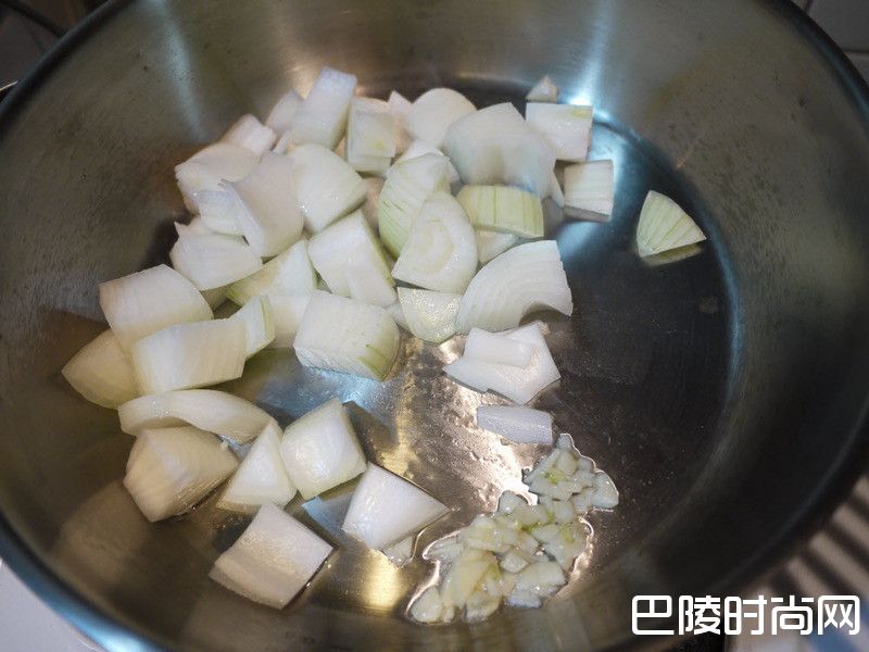 4放入大蒜炒香后加入洋葱,炒至洋葱变成透明状。