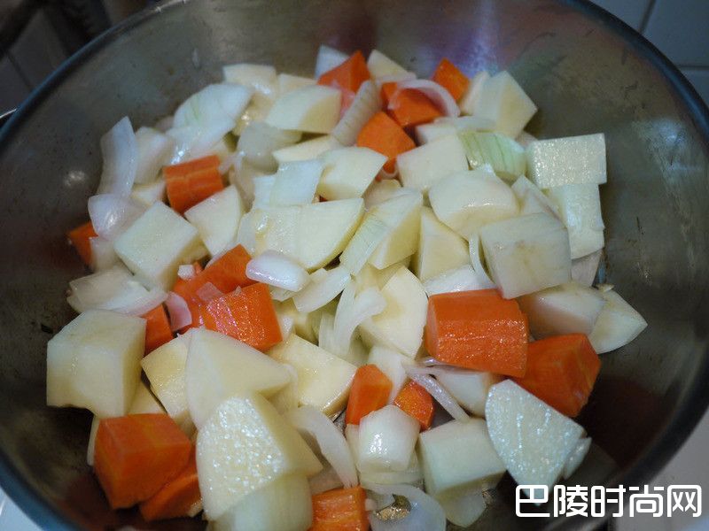 5将马铃薯及胡萝卜放入锅中,一起翻炒,让油脂均匀裹住。