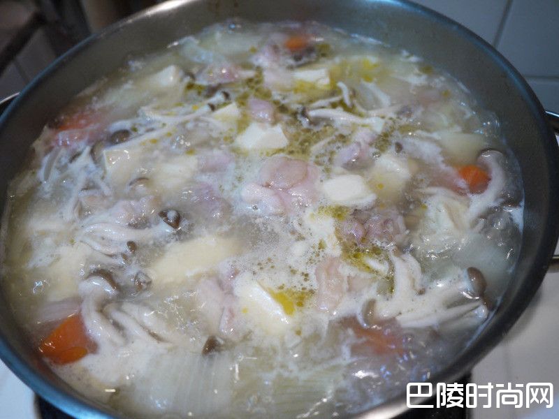 7将鸿喜菇及鸡肉加入锅中,煮约5分钟后,将1小盒浓汤块(1大盒浓汤块中有两小盒)切成小块后,并同秋葵放入锅里搅拌。