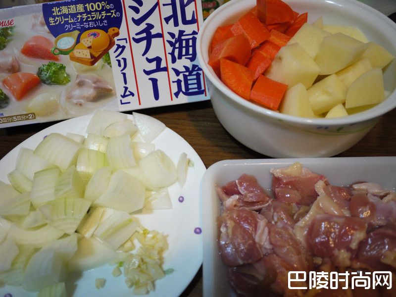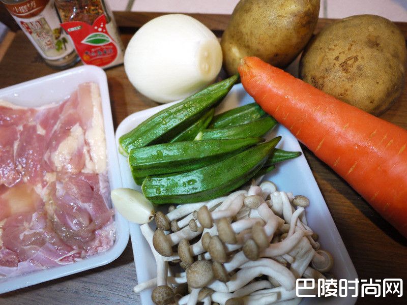 2马铃薯、胡萝卜削皮切块;洋葱及鸡肉切成一口大小。秋葵以盐搓去细毛,鸿喜菇用手剥成小丛。大蒜切碎。