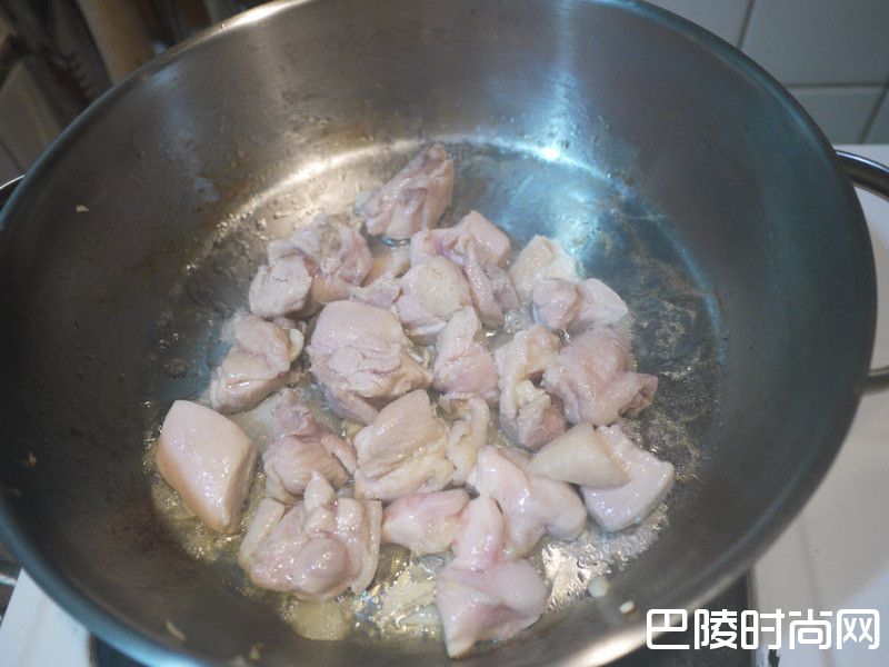 3起油锅,放入鸡肉煎至变色,盛起。