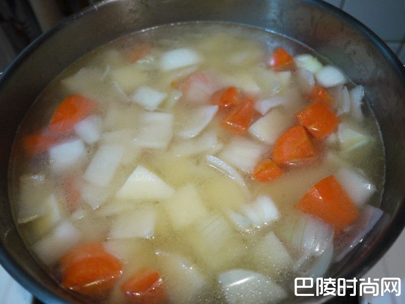 6加水淹过锅中食材,盖上锅盖煮至马铃薯及胡萝卜软化。