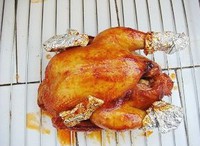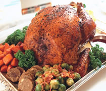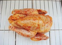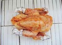 5. 在煮火鸡馅饼的同时,将香料2塞入已退冰的火鸡中,先用160∼180℃烤1小时,在将烤箱温度调至200度继续烤1小时即可。另外,每20分钟需将自火鸡流出的肉汁淋至火鸡上,以免鸡皮失去光泽。
