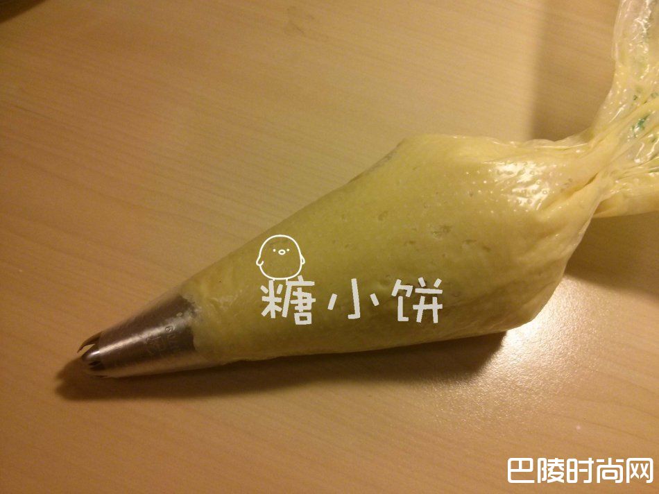 6、裱花袋剪个口子,塞入八齿裱花嘴,装入拌好的曲奇面团;