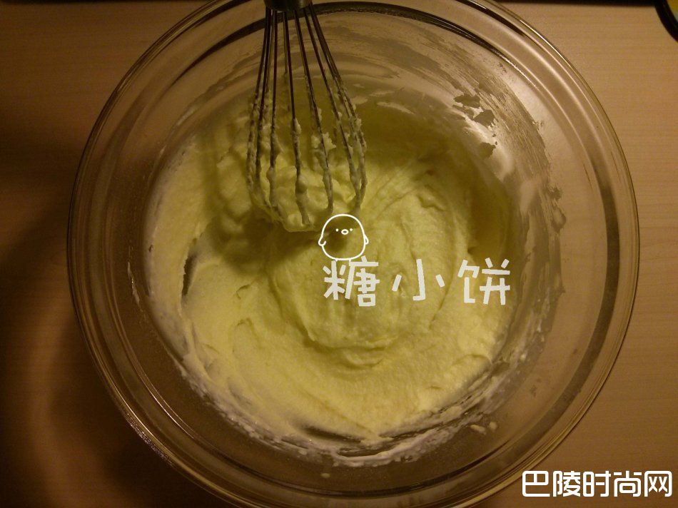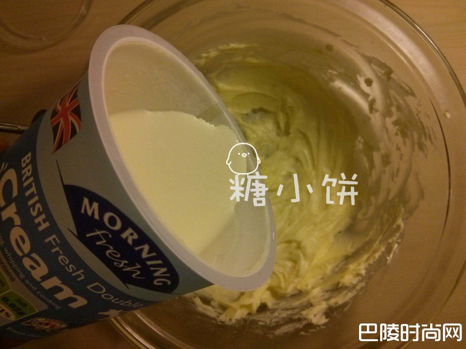3、将回温到室温的淡奶油分次加入步骤1打发号的黄油中打匀;