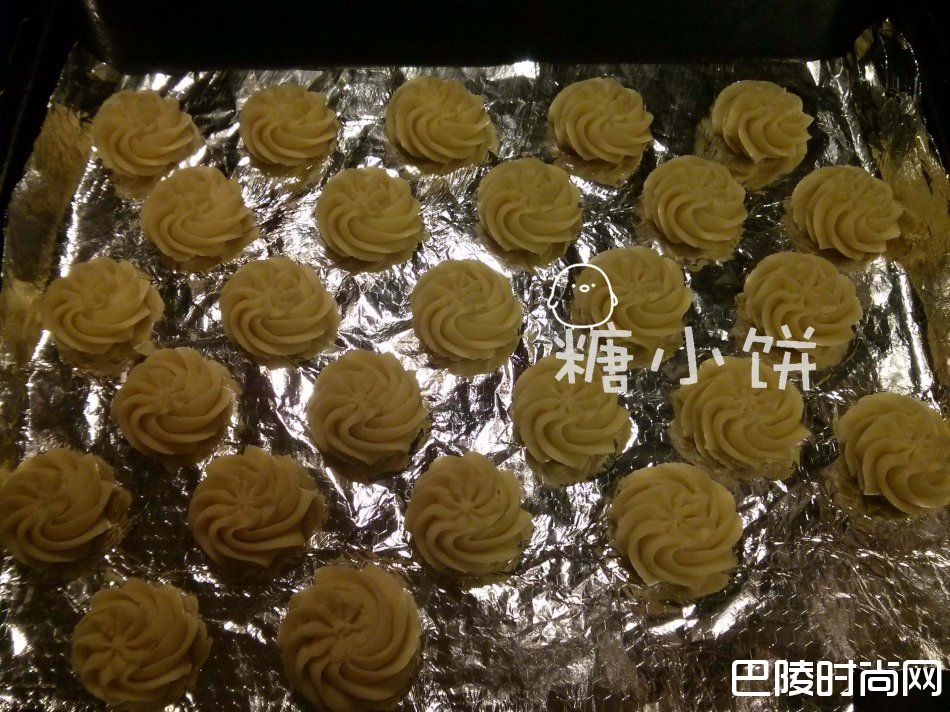 7、挤在铺好锡纸的烤盘上;