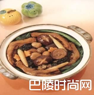 6、烧热1/2汤匙油,炒匀(3)的蔬菜,洒入酒及加入余下的蔬菜煨料,煮至滚,慢慢注入水溶生粉,拌至微稠。7、瓦煲内烧热1/2汤匙油,放入鸭掌、(6)的材料