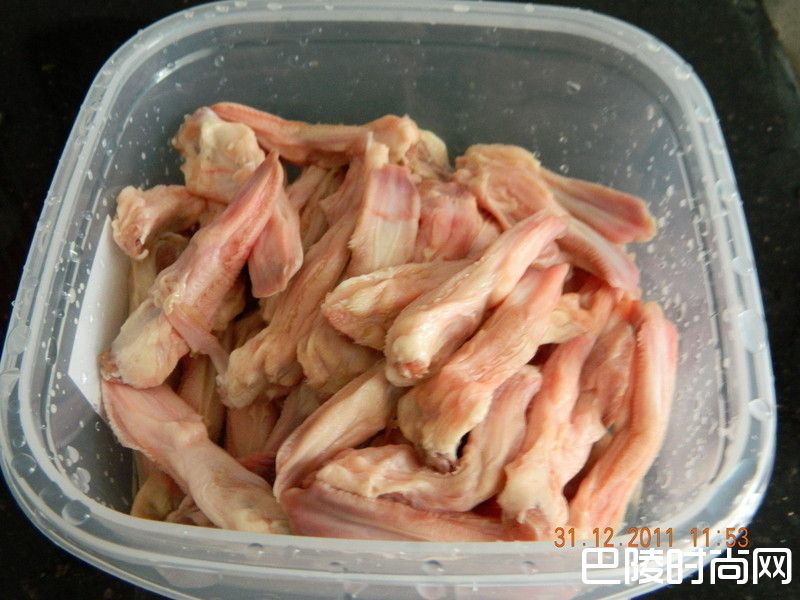 1先将鸭舌解冻,冲水洗净,之后「索」干鸭舌表面的水份。