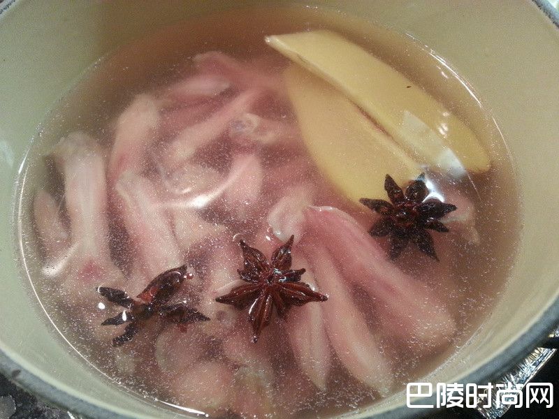 2锅里烧热一锅水,下姜片和八角。