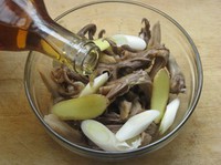 4、将沥水后的鸭舌放入碗中,加入15ml生抽和15ml料酒、白糖、盐、葱、姜、蒜拌匀后,放冰箱冷藏腌制5个小时。