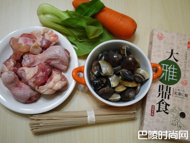 1蛤仔泡水加入一小匙盐吐沙后洗净备用。起一锅滚水川烫鸡腿去血水后捞起,再起一锅滚水放入鸡腿与姜片,滚后转小火煮约20~30分钟