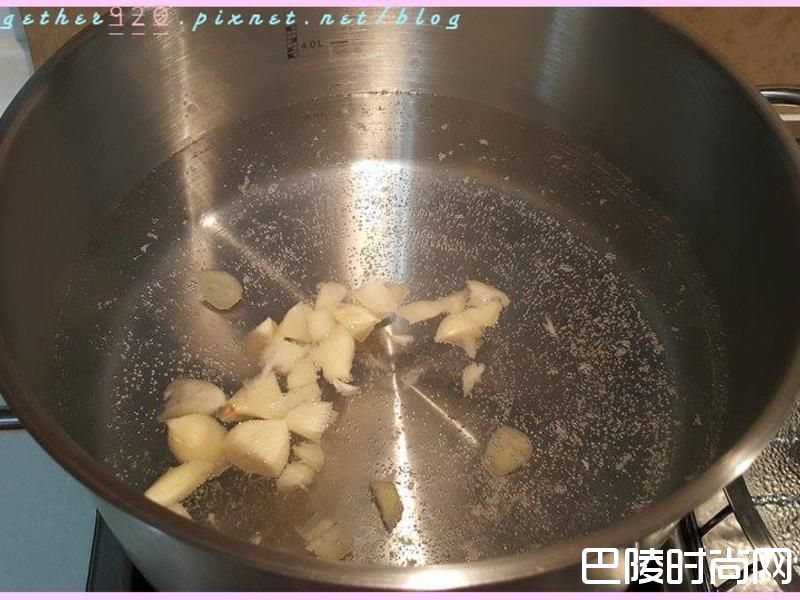 3转中火,把蒜头放入约3公升的水中> 盖锅煮,等水滚。 (可先把鸡脖子、鸡脚..等,一些耐熬煮的,一起放入锅中,鸡腿肉不能先放喔!)