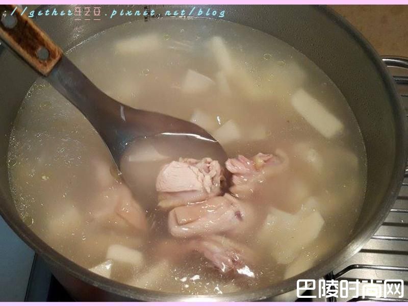 5放鸡肉、少许米酒> 盖锅盖在煮10分钟。