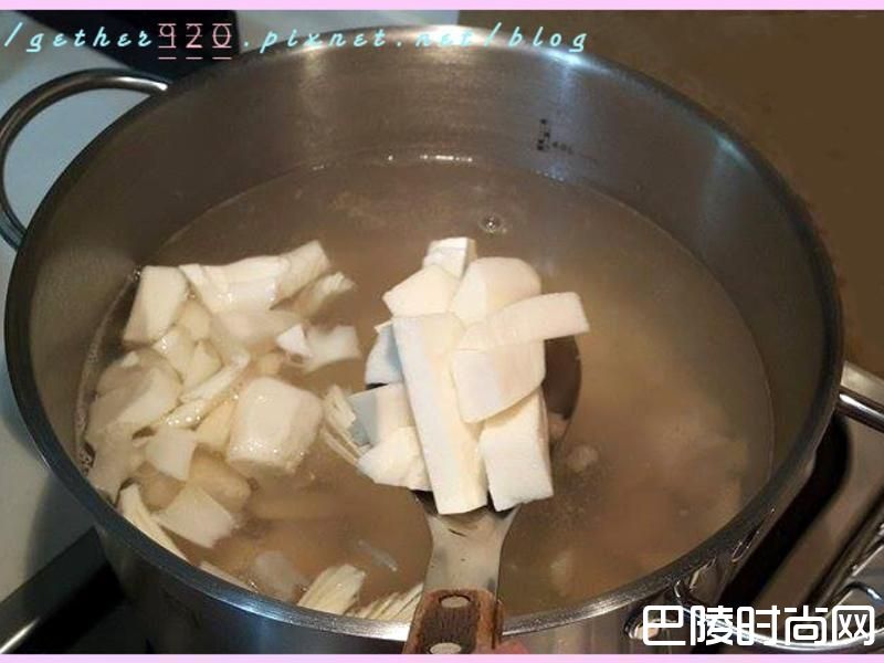 4水滚后放入笋子> 盖锅盖,转中大火,煮约15分钟。
