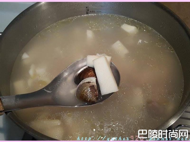 6最后放入蛤仔> 不用盖锅盖,等水大滚后,转小火> 加约3小茶匙的盐,试味道(不够再加盐即可,不可一次加太多)> 关火。
