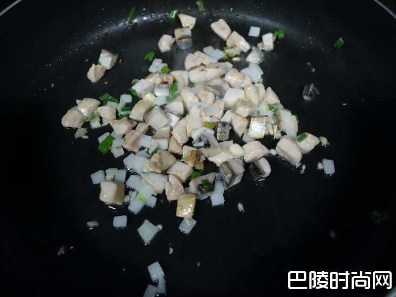 做法将咸鱼切成2cm大小的菱形块。