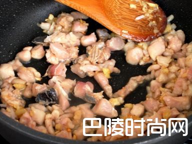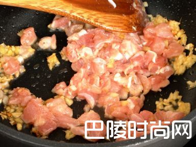 6用姜茸和蒜茸把鸡肉炒香