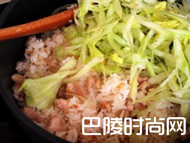 10添加回鸡、 咸鱼、 和生菜丝,拌匀