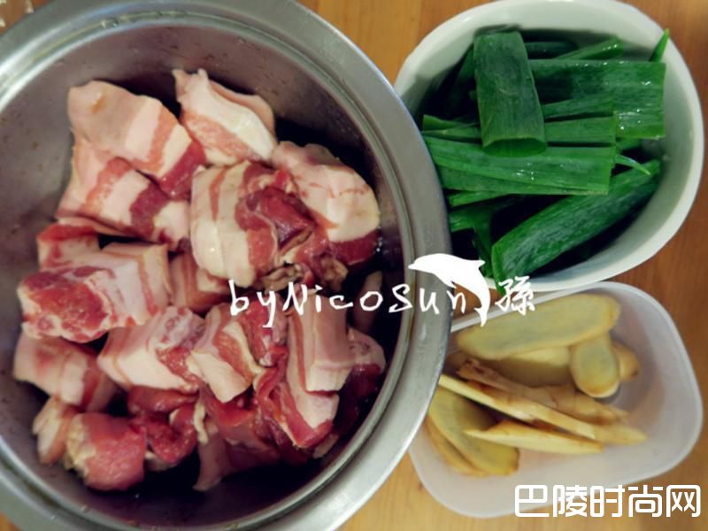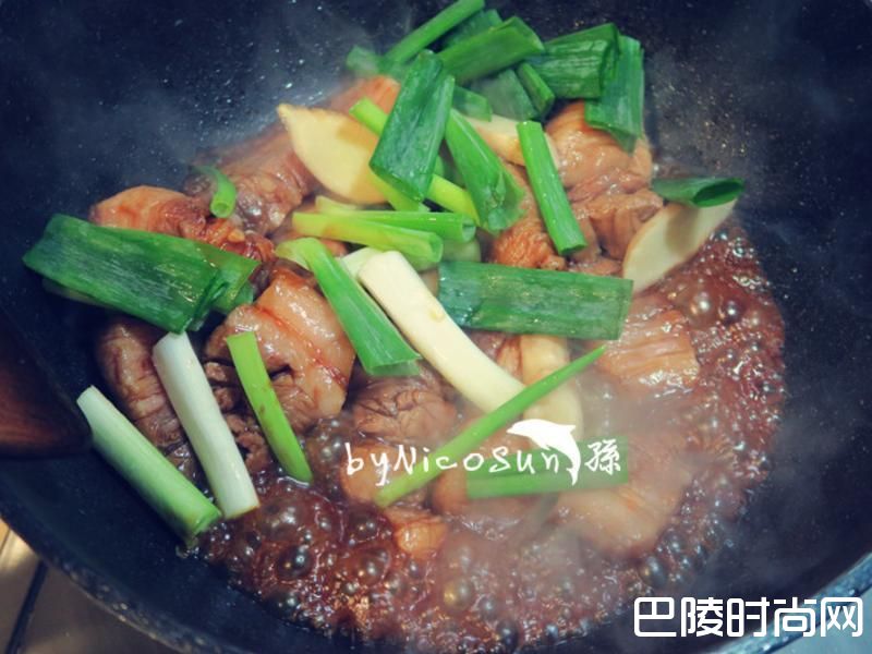 5依序放入葱.姜.绍兴酒(黄酒即可)和酱油