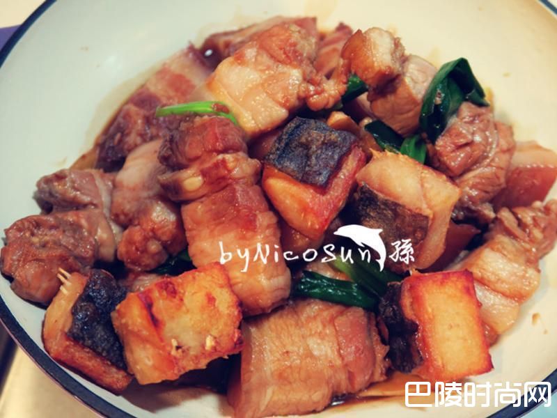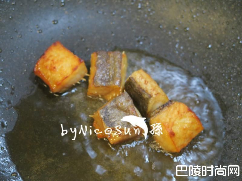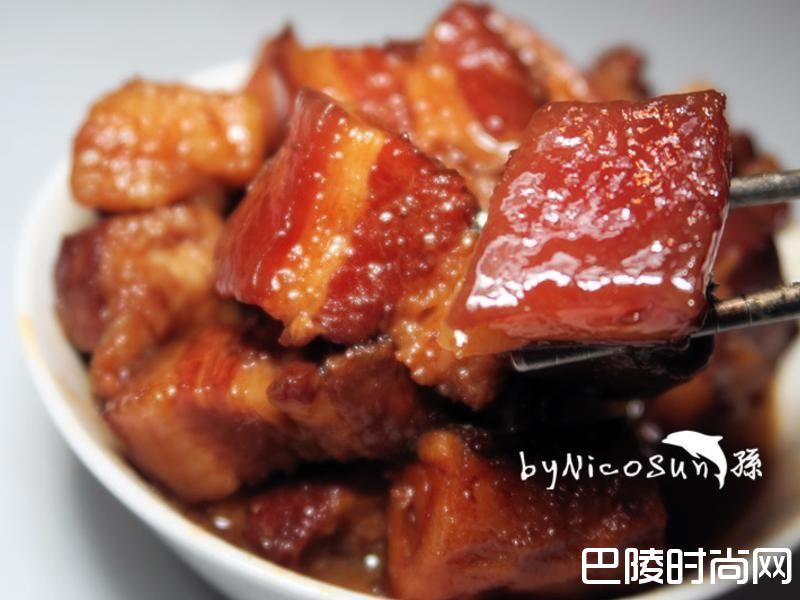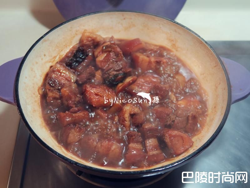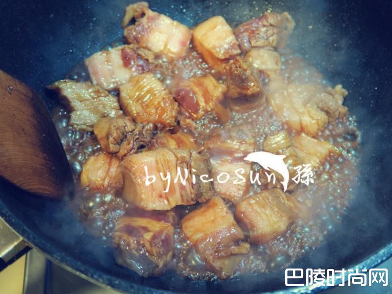 4起一油锅小火炒冰糖.融化后放入五花肉炒酱色