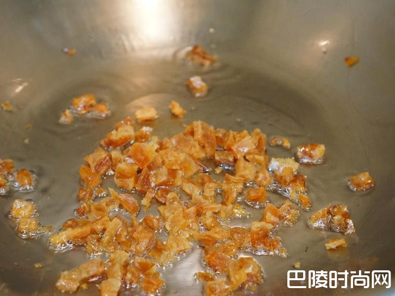 3热锅倒入3茶匙油(油量可自行控制),先将咸鱼粒放入锅中小火炸至香酥,之后捞出备用。