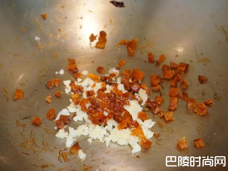 5用锅中余油炒香大蒜,再加入刚刚的咸鱼一起拌炒,约15秒。