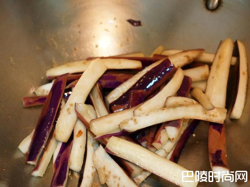 4再将茄子倒入锅中小火烧软,之后捞出备用。