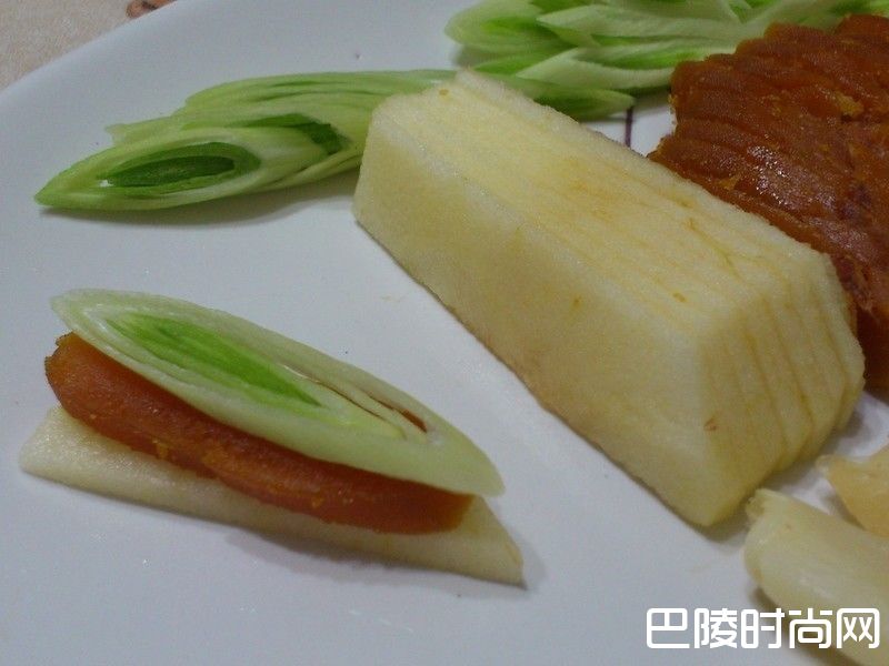 3乌鱼子不要煎到表面干掉,煎的过程若中间火太大,可以稍微往旁边移动一下。米酒收干后,取出切薄片,佐苹果、蒜苗片食用。