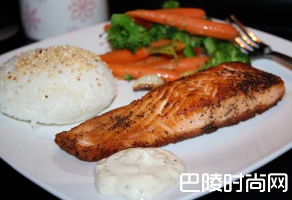 三文鱼,料酒,盐,黑胡椒,橄榄油,蒜,水煮胡萝卜,芥蓝