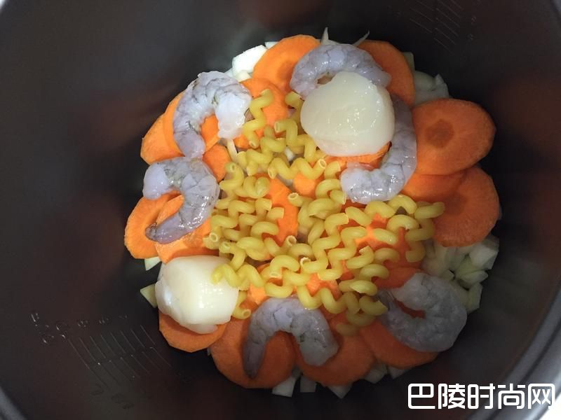 3依以下次序,把食材放入电锅:洋葱、红萝卜、螺丝通粉、虾和带子。