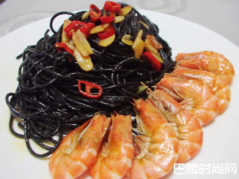 义大利面200g 虾子酌量 蒜头5个 辣椒2根 鸡粉2匙 盐煮面用少许 做法