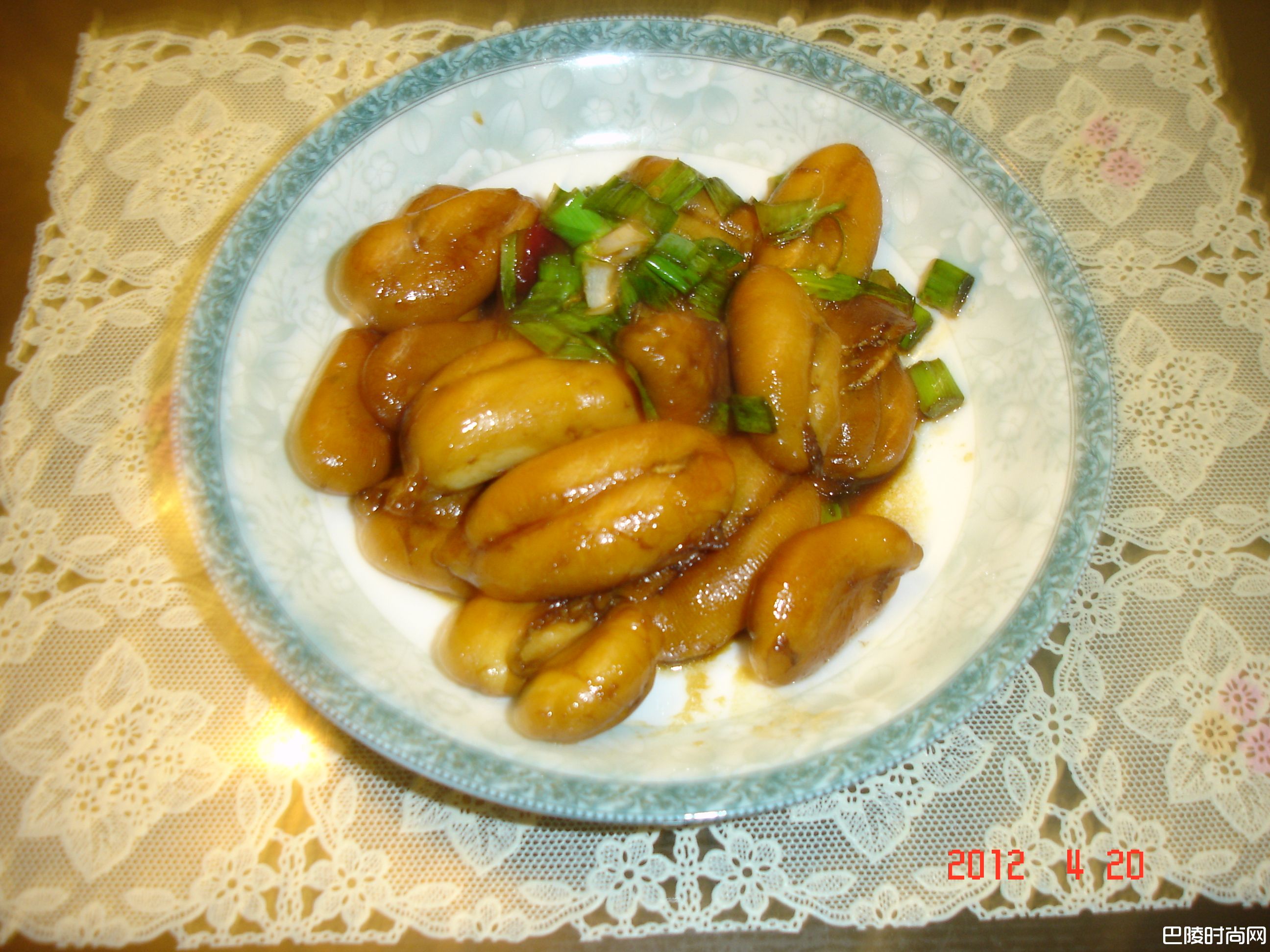 3.约烧2-3分钟加少许清水及适量的酱油煮到锅内水干,放入大蒜,加入适量味精出锅即可。
