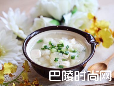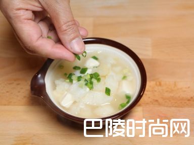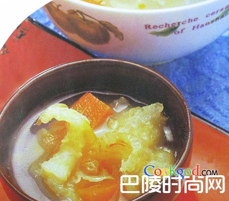 2、将鱼肚、胡萝卜、料酒、姜、葱同放炖锅内,加水800毫升,武火烧沸,再用火炖煮35分钟,加入盐、味精、胡椒粉、香油调味即成。